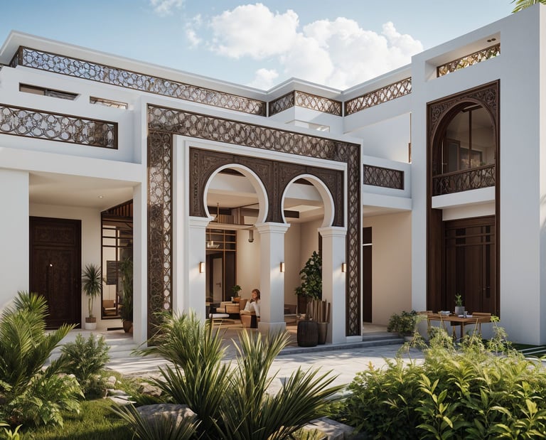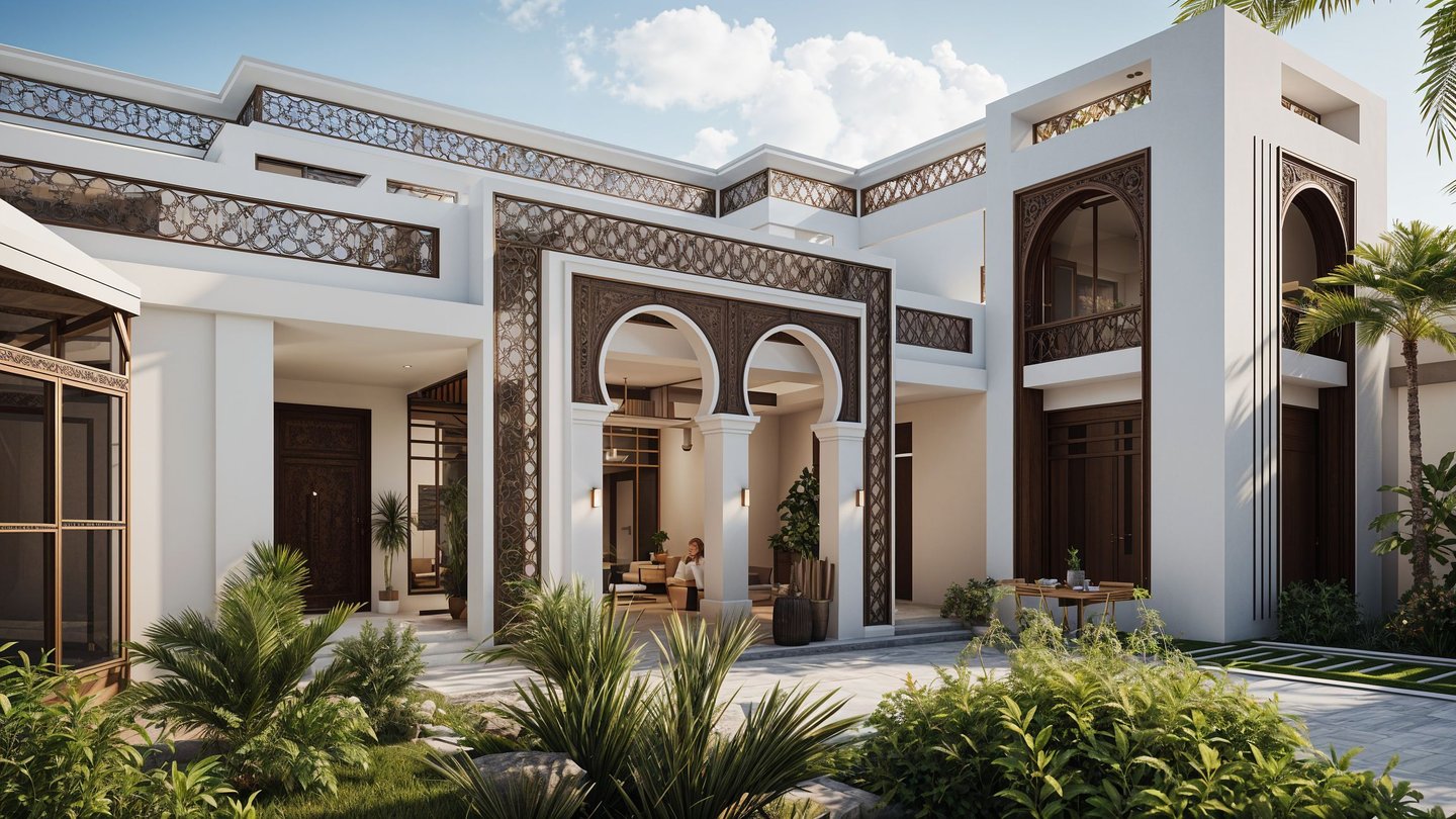 This private retreat blends contemporary spatial planning with traditional Arabic design elements, creating a serene and elegant escape. Arched entrances and decorative bronze mashrabiya panels define the architecture’s cultural depth while preserving modern minimalism. The layout ensures openness, privacy, and harmony between built space and landscaped nature.