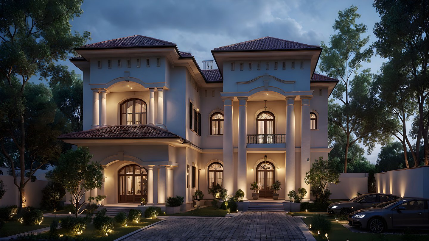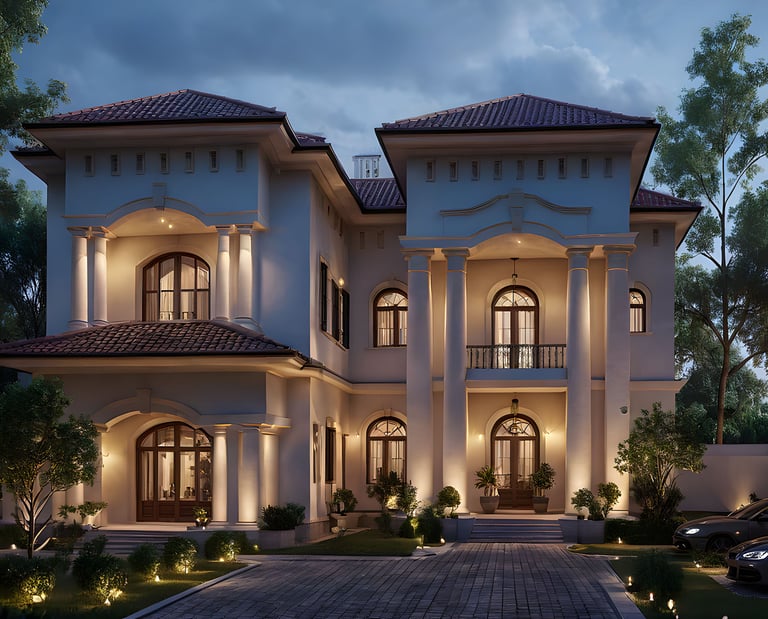 This villa reflects a grand classical European style with monumental columns, arched windows, and a stately central portico that defines its timeless identity. The façade is balanced with sculptural ornamentation and refined symmetry that express power and prestige. Every detail in the design speaks of architectural nobility tailored for luxurious private living.