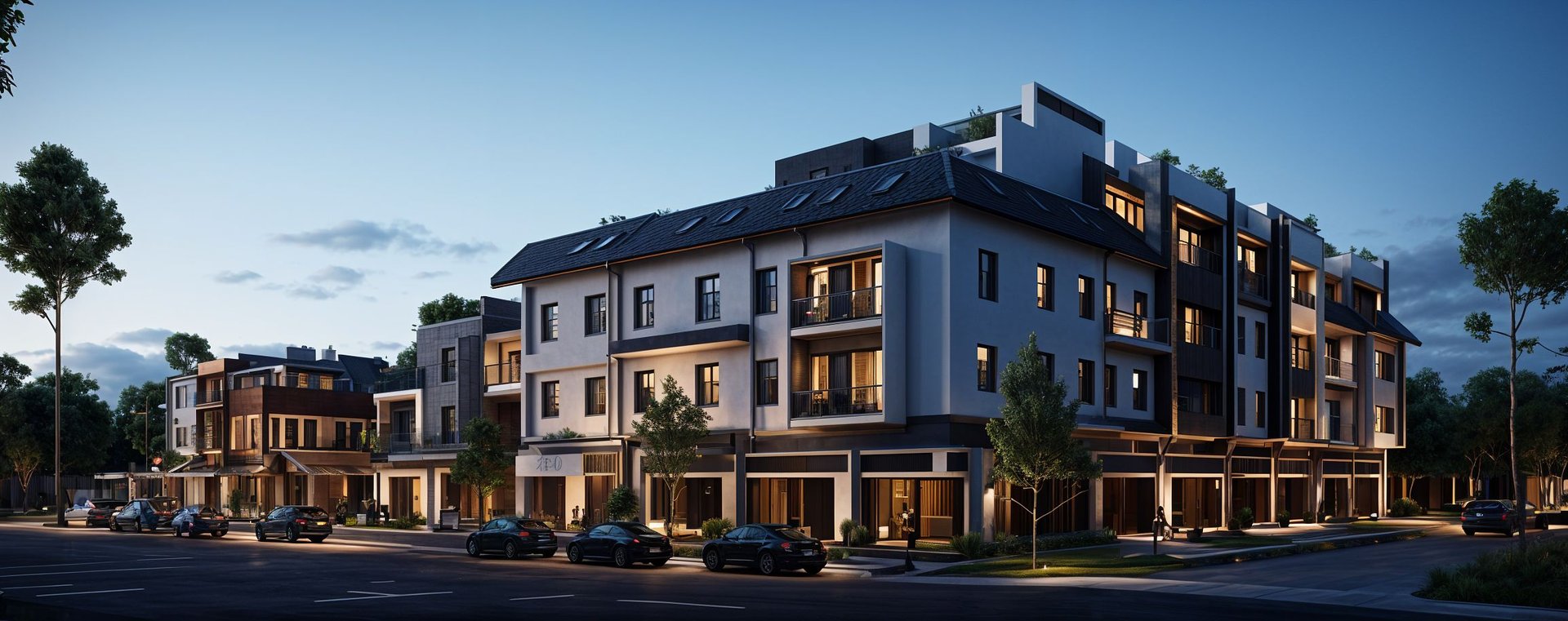 This modern residential compound features a series of townhouses with clean geometry, wood-accented façades, and rooftop terraces. The layout promotes both privacy and community, ideal for families seeking a secure and stylish living environment. Each unit is crafted to blend functionality with modern design aesthetics.