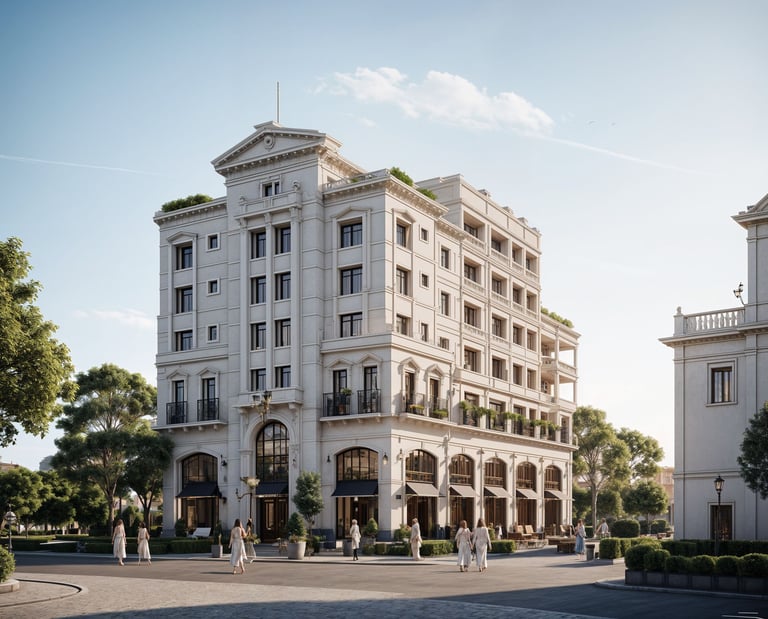 This boutique hotel captures timeless European charm through its neoclassical façade, vertical symmetry, and ornate details that elevate the guest experience. With arched entrances and lush terraces, the design creates a welcoming yet exclusive atmosphere. The architecture speaks to refined travelers seeking sophistication in every detail.